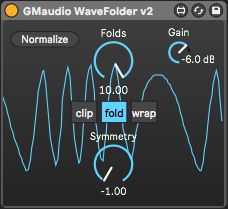 GMaudio WaveFolder is a wave shaping audio effect synonymous with East-Coast Modular Synthesis. With very few parameters you can drastically change your sound, add it before or after filters to add more harmonics or completely mangle your signal.